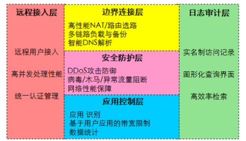 出口區(qū)作為網(wǎng)絡的邊界,主要負責承擔邊界網(wǎng)絡的數(shù)據(jù)轉(zhuǎn)發(fā)、流量控制、安全防護、安全審計等功能。出口區(qū)分層功能如下圖所示: