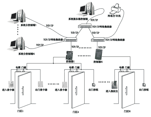 出入口控制系統(tǒng)基本組成部分由:讀卡器(指紋儀)、感應(yīng)卡、門禁控制器、電鎖、管理軟件、管理服務(wù)器、開門按鈕等.系統(tǒng)拓?fù)鋱D如下: