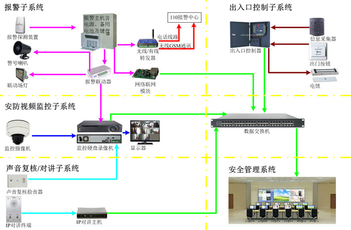 系統(tǒng)一般包括安防視頻監(jiān)控子系統(tǒng),聲音復(fù)核/IP對講子系統(tǒng),報(bào)警子系統(tǒng),出入口控制子系統(tǒng)等多個模塊共同構(gòu)成。包含圖像采集設(shè)備,報(bào)警設(shè)備,控制設(shè)備及傳輸設(shè)備等多種類型產(chǎn)品。