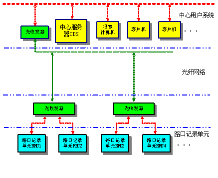 道路車輛自動(dòng)記錄系統(tǒng)由路口記錄單元(RRU)、 光纖傳輸網(wǎng)絡(luò)和中心用戶系統(tǒng)三部分組成,路口記錄單元通過(guò)光纖LAN和主管部門內(nèi)部網(wǎng)絡(luò)連接,完成數(shù)據(jù)傳遞。