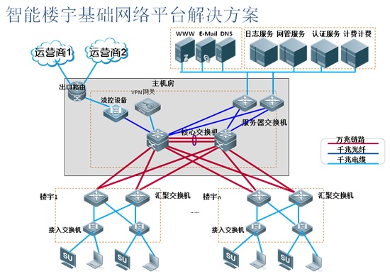 基礎(chǔ)網(wǎng)絡(luò)平臺(tái)架構(gòu)一般可以分為核心層、匯聚層、接入層,并根據(jù)信息系統(tǒng)的具體情況,部署防火墻、身份認(rèn)證與計(jì)費(fèi)系統(tǒng)、全網(wǎng)安全管理,行為審計(jì),SSL VPN等系統(tǒng),并實(shí)現(xiàn)對(duì)網(wǎng)絡(luò)資源平臺(tái)的統(tǒng)一管理。
